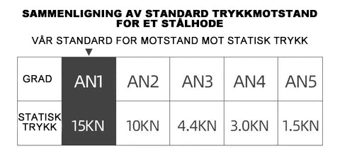 - Knusing og kompresjonsmotstand --- for standard stÄlhode: standard innebygd stÄlhode, vaske- og rullebestandig. Den holder et trykk pÄ 1,5 tonn og beskytter fÞttene mot skader.