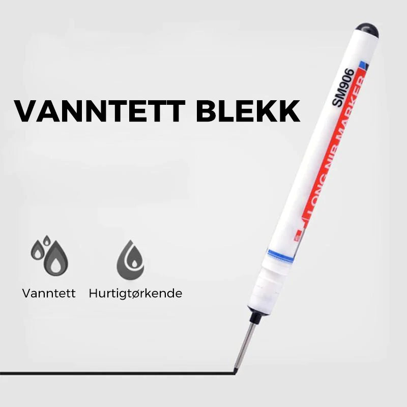 Den har en utvidet spiss for å skrive mellom trange sprekker eller på trange steder, som spiker- og skruehull i rammer og tre. Linjalen på 30 mm på siden har linjer med 5 mm intervaller for å hjelpe deg med å måle.