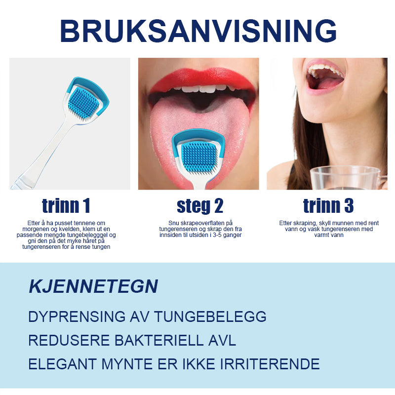 - Bruk rensegelé for tungebelegg i stedet for tannkrem, 2-3 minutter for å fjerne pusten dypt.