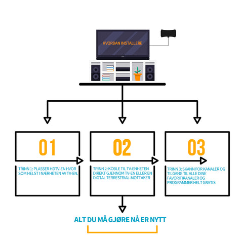 • Ingen internett kreves, du trenger bare å koble HDTV-antennen til TV-en, koble til forsterkerens signalforsterker og skanne etter kanalen (skanning etter kanaler kan vare rundt 1 time). Fungerer i nye smart-TV-er og gamle TV-er også!