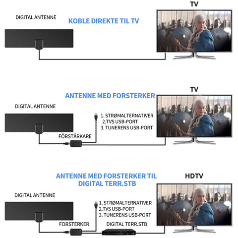 • Lang kabel - Den lange koaksialkabelen gjør det enkelt å plassere antennen på det beste mottaksstedet i hjemmet ditt. Antennen kan drives av enten et stikkontakt eller USB-porten på en TV.