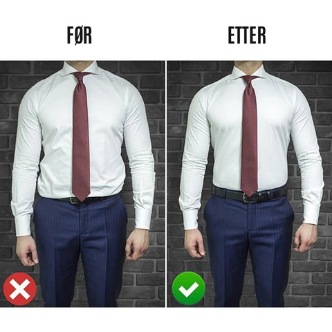 Dette er den enkleste og mest effektive måten å holde skjorten tett inntil kroppen din. Denne bruker elastisk spenning for et unikt og enkelt brukbart produkt som gir deg en merkbart forbedret stil. Den er ikke bare behagelig og skjult, men gir også kroppen et slankere utseende. Gummigrep og knappespalte garanterer at skjorten din holder seg innenfor linningen, holder den rett og nær kroppen. Ingen flere pinlige blikk!