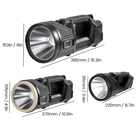 Power Bank-funksjon: innebygde høykapasitetsbatterier på 6000 mAh som kan generere langvarig lys. Den tillater også nødlading av mobiltelefoner når som helst utendørs.