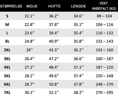 STĂRRELSETABELL