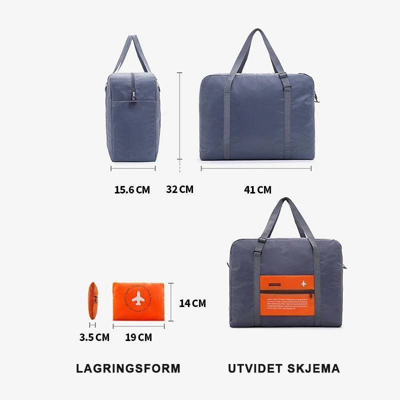 Reiseposen har en stropp som gjør at vesken lett kan gli over bagasjehåndtaket uten problemer og rot i pakken. Det er en multifunksjonell håndveske som er i stand til å spare reisen din. Du kan enkelt brette den pent i bærbar størrelse når den ikke er i bruk.
