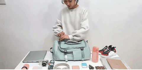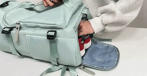 TENKENDE DESIGN: Det utformede atskilte skorommet holder skoene og skittent utstyr atskilt fra rene ting. En sidelomme for å holde vannflaske, notatbøker, pass, hodetelefoner osv. Frontlommen med glidelås kan holde iPad/kindle. Har flere glidelåslommer for å skille små tilbehør.