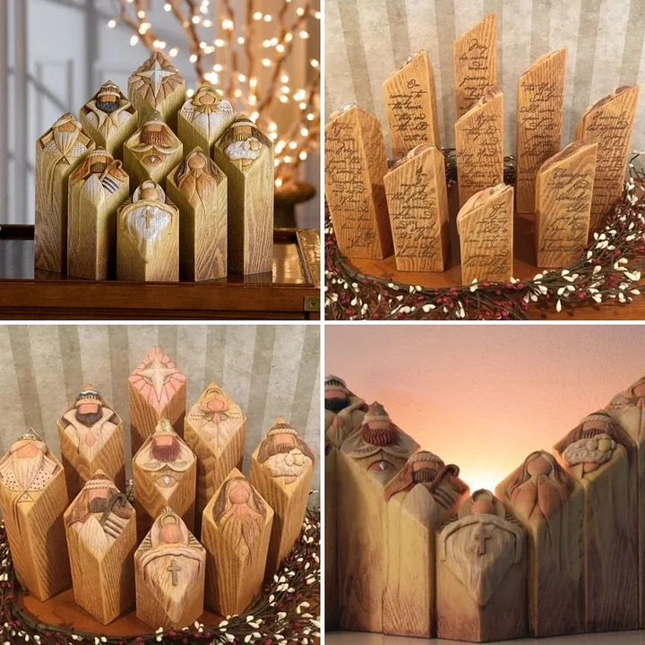 Fødselsfigurer inkluderer babyen, stjernen, Maria og Josef, en engel, de tre kongene og en hyrde som vugger en sau. Imponerende og merkbar på bordet eller mantelen.