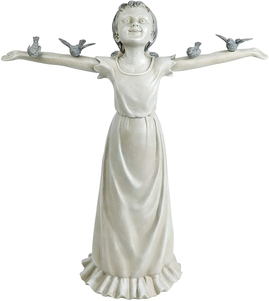 ✔NATURSPLENDER: Denne lille jentestatuen står med åpne armer og fungerer som en abbor for de fjærkledde vennene hennes. I tillegg gjenspeiler smilet til denne statuen naturens skjønnhet og prakt.