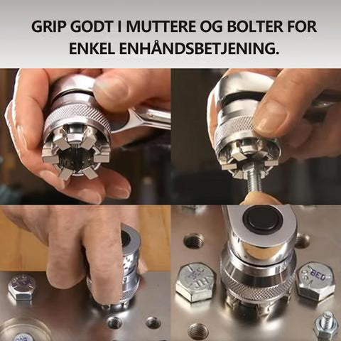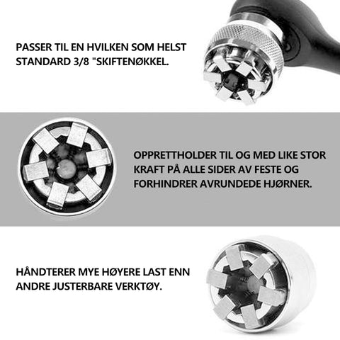 Var profesjonelt designet for å fungere omtrent som tradisjonelle stikkontakter, men i et enkelt praktisk verktøy. I motsetning til restriktive stikkontakter, håndterer den lett høye dreiemomenter og griper godt og greit inn eventuelle muttere og bolter innenfor det kontinuerlig justerbare størrelsesområdet.