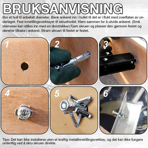 - â Enkel Ă„ bruke - 1. Bor et hull til anbefalt diameter. 2. Bank ankeret inn i hullet til det er i flukt med overflaten av underlaget. 3. Fest innstillingsverktĂžyet til skruehodet. Klem sammen for Ă„ utvide ankeret. (SmĂ„ stĂžrrelser kan stilles inn med en skrutrekker) 4. Fjern skruen og plasser den gjennom fiksturen og deretter tilbake i ankeret. Stram skruen til festet er festet.