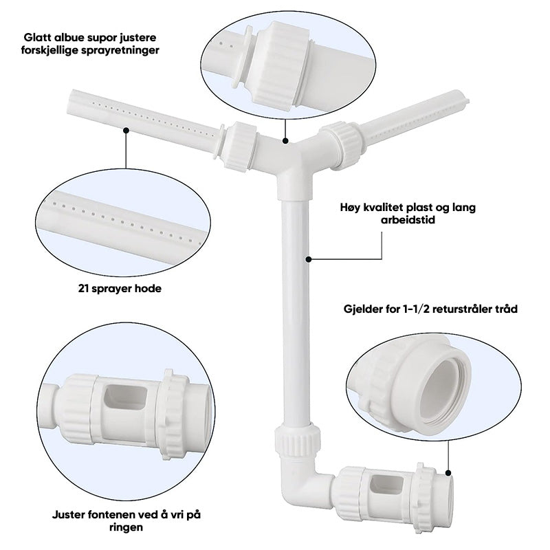 Enkel installasjon og drift: Vår bassengfontenesprøyter er designet for enkel installasjon og brukervennlig drift. Med en enkel oppsett kan du raskt nyte fordelene med en avkjølende tåke og en fengslende fontenevisning i bassenget ditt.