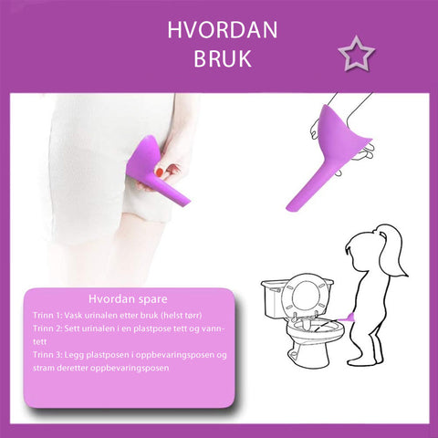 - Endre tradisjonen og gjøre livet enklere - Den knebøyfrie kvinnenes urinal lar deg stå opp og tisse uten å bekymre deg for gjengrodde jungler, snødekte vintre og skitne toalettseter på offentlige toaletter. Du kan frigjøre deg i en situasjon som er upraktisk å gå på toalettet.