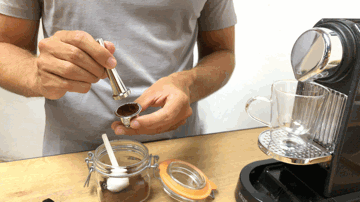 Når du fyller kaffen, må den fylles og komprimeres for å få mer pulver i den, slik at kvaliteten på kaffen blir bedre.
