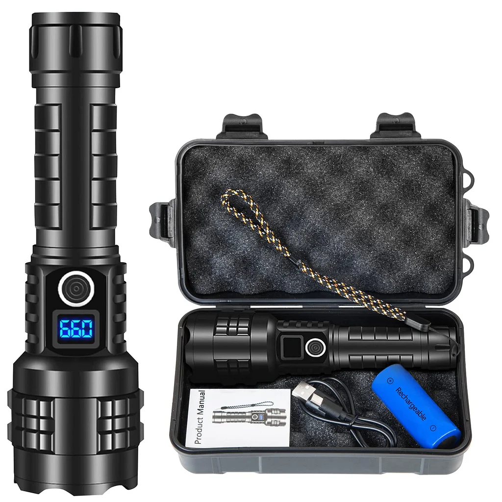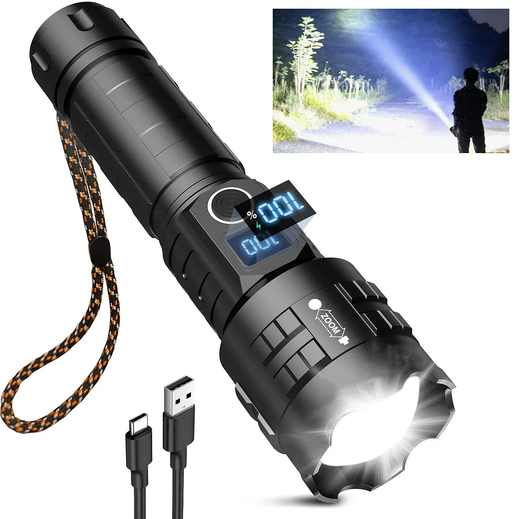 - LCD DISPLAY STRØM & USB OPPLADBAR LOMMELYKT-Lommelykten har en LCD-skjerm som viser batterikapasiteten, slik at du raskt kan bedømme hvor mye strøm som er igjen. Det høykapasitets 6800mAh-batteriet kan gi 4-8 timers belysning. Lommelykten som kan lades opp med type C-port, den lyse lommelykten kan lades med billader, datamaskin, strømbank eller en hvilken som helst USB-uttak osv. Også den supersterke lommelykten kan brukes som en powerbank for å lade telefonen i nødstilfeller også! Super egnet for camping, fotturer, hundeturer.