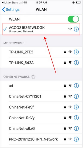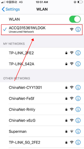 - Åpne telefoninnstillingene og gå inn i WLAN for å finne WIFI i begynnelsen av ACCQ for å koble til.