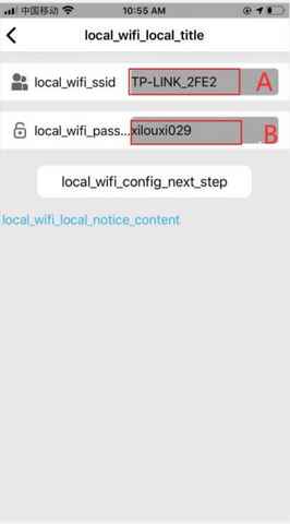 6.Bekreft at A skal være din egen ruter-ID; skriv inn passordet til den valgte trådløse ruteren i posisjon B; klikk på local_wifi_config_next_step-knappen.