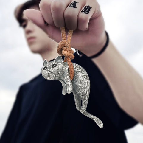 - Dette sjarmerende kjedet har et lekent katteanheng, komplett med sitt elskverdige uttrykk, hengende i en myk taustråd.